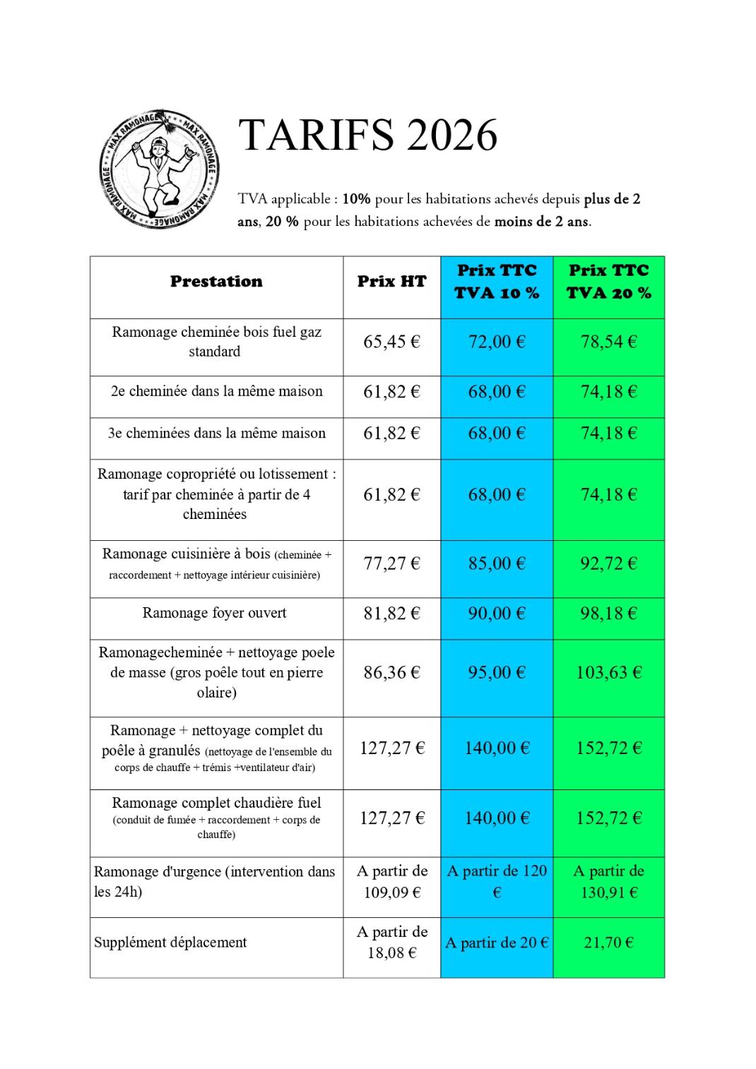 Grille tarifaire 2026 Max Ramonage.
